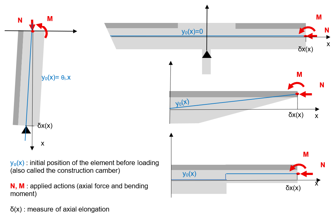 This convention simplifies the parameters for axial supports, loads, construction camber (including geometric imperfections), enables coherent measurement of element elongation (intuitively taken at mid-height), and avoids dependency on variable RC section properties (notably neutral axis depth).