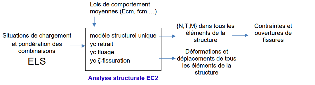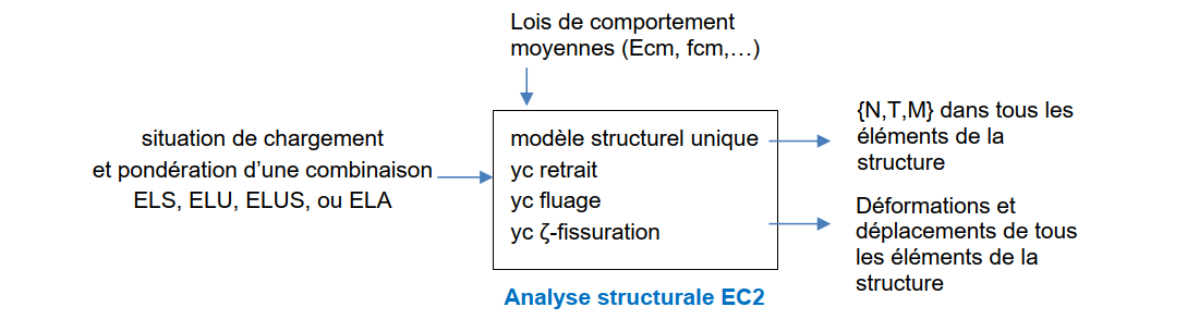 Il est important de souligner qu’hormis certaines caractéristiques du modèle pouvant être négligées en fonction de l’amplitude des sollicitations, la théorie de l’eurocode 2 veut que ce soit le même modèle d’analyse structurale, avec les mêmes lois de comportement des matériaux qui soit utilisé pour déterminer les sollicitations {N,T,M} et les déformations, quelque soit le type d’état limite étudié : ELS, ELU, ELUA et ELUS.