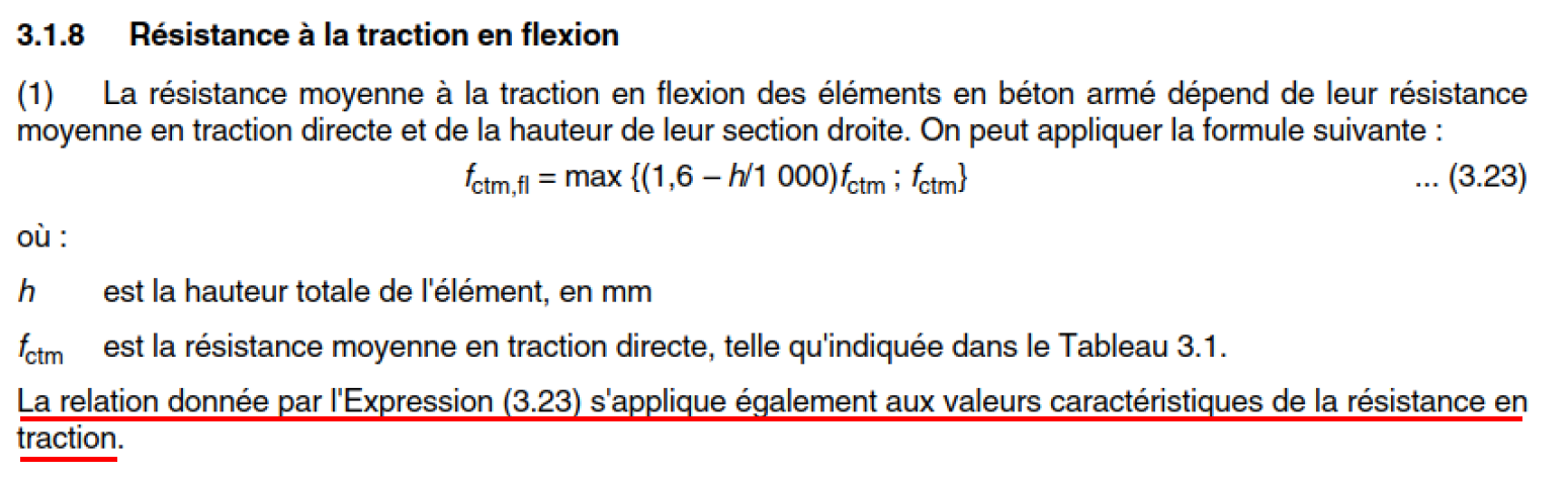 L’extrait concerne la résistance du béton tendu. La seule raison d’être de la phrase soulignée est d’indiquer au lecteur la possibilité d’étendre la formule proposée en (3.23) pour la valeur moyenne, à la valeur « caractéristique » de la résistance en traction du béton.
